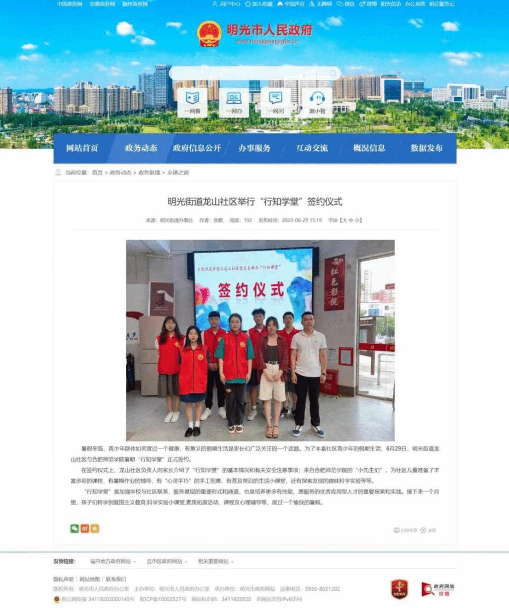 本网讯 6月29日,教师教育学院“行知学堂”小先生们来到了滁州市明光市明光街道龙山社区,组织开展了暑期“向阳花行知学堂”,服务务工人员子女和留守儿童。小先生们为小学员送去了党史教育、安全教育、科学实践课、传统民俗、心理健康教育、绘画和舞蹈等课程,丰富了小学员的暑期生活,同时也弘扬了中华传统文化,厚植了小学员们爱党爱国爱社会主义的情怀。安徽省明光市人民政府网对学堂开办进行了报道。(教师教育学院:王磊 范宇嘉)