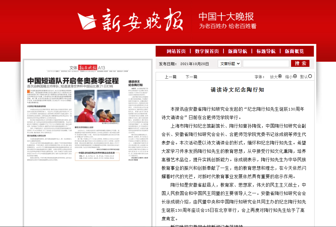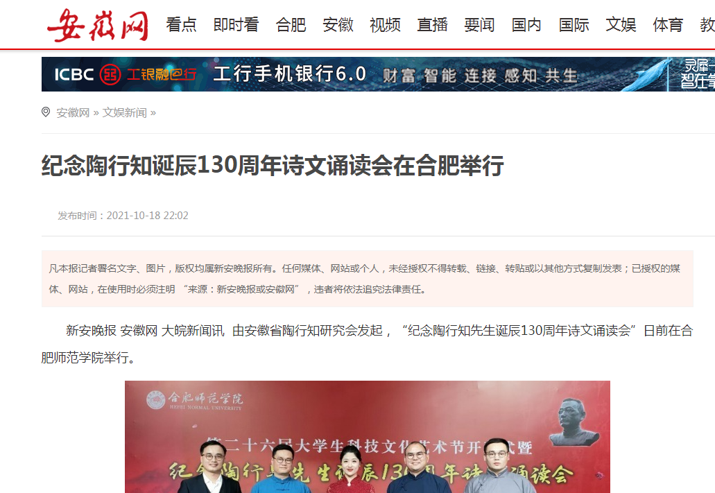本网讯 10月13日下午,由安徽省陶行知研究会、beat365唯一官方网站主办的院第二十六届大学生科技文化艺术节开幕式暨纪念陶行知先生诞辰130周年诗文诵读会在锦绣校区音乐厅隆重举行。安徽电视台公共频道、《新安晚报》、安徽网、安徽教育网、安徽共青团网等媒体对此进行了报道。安徽电视台公共频道还采访了来院参加活动的上海陶行知纪念馆副馆长、陶行知曾孙陶侃和安徽省陶行知研究会会长、我院党委书记徐成钢。(省陶研会、院团委)