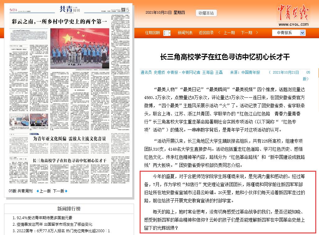 中国青年报2021年10月21日第05版对此进行了报道。(院团委)