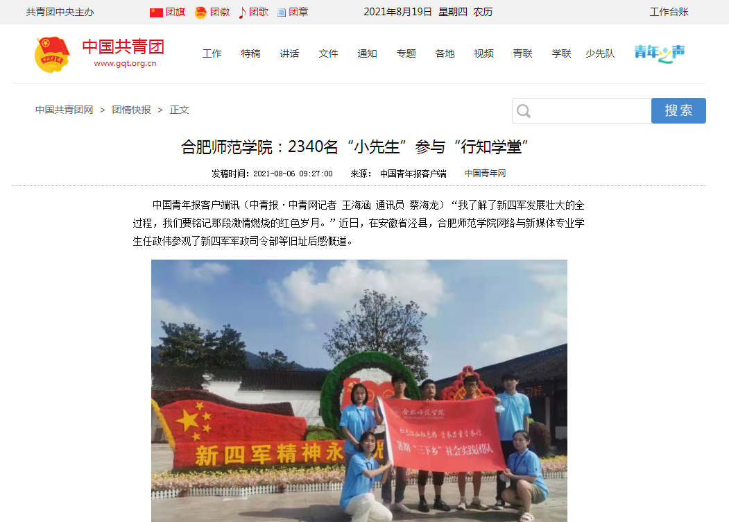 中国共青团网报道我院暑期“行知学堂”实践活动