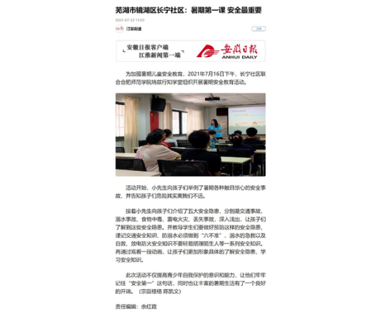 本网讯 近日,文学院行知学堂“小先生”们来到了芜湖市镜湖区汀棠街道长宁社区,组织开展了“暑期第一课,安全最重要”安全教育活动。
