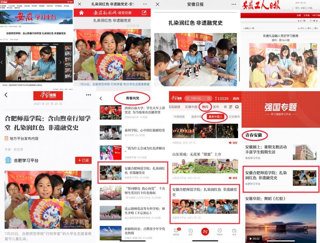“学习强国”安徽学习平台、“学习强国”合肥学习平台分别对此活动进行报道,“学习强国”平台“青春向党”、“最美中国人”、“党史学习教育”、“青春安徽”等多个全国专题转载报道,安徽新闻网、安徽日报、安徽工人日报等多家媒体也对活动持续关注。(艺术传媒学院:潘文锦)