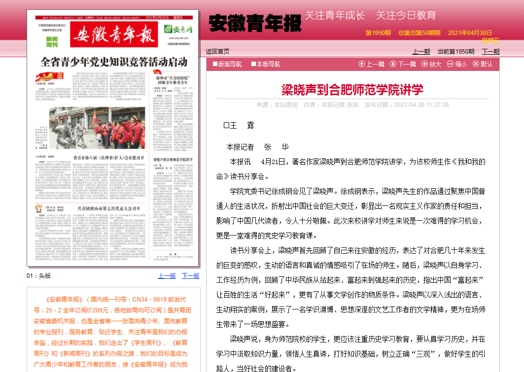 本网讯 4月21日下午,在第26个“世界读书日”即将到来之际,著名作家梁晓声先生来我校讲学,在锦绣校区学术报告厅为我校师生作《我和我的命》读书分享会。4月30日,《安徽青年报》在头版对此进行了报道。(院团委)