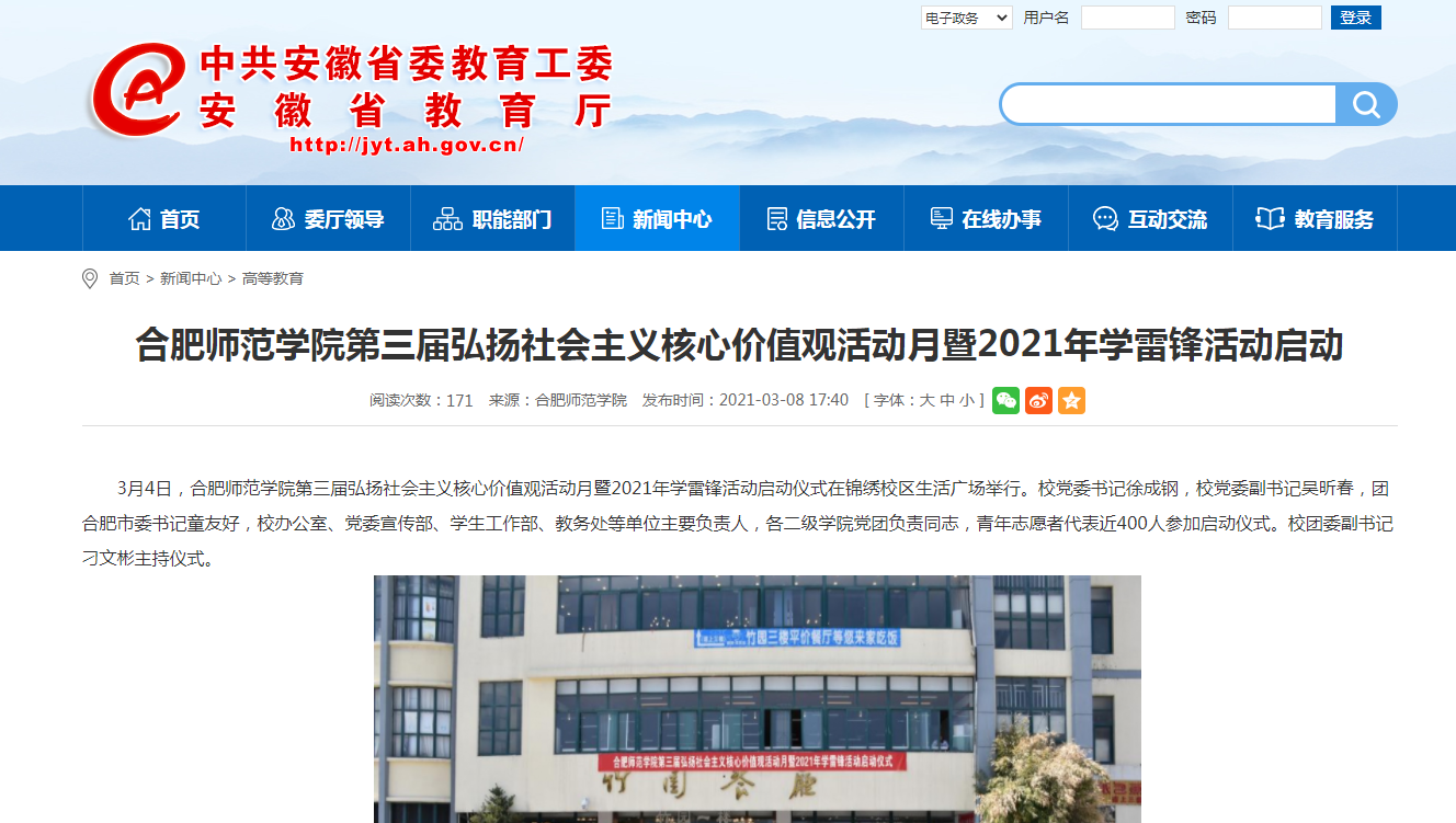 近日,安青网、安徽教育网对我校举行第三届弘扬社会主义核心价值观活动月暨2021年学雷锋活动启动仪式进行了报道。(校团委)