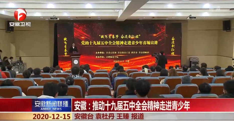 《安徽新闻联播》记者对我院党委书记徐成钢和学生代表文学院邓子怡同学进行了采访,并以“安徽:推动十九届五中全会精神走进青少年”为题对本次活动进行了报道。(新闻中心)