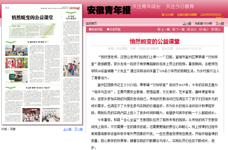 9月2日,安徽青年报在第5版《悄然蜕变的公益课堂》中,对我院宣州区寒亭镇行知学堂活动进行了报道。(院团委)