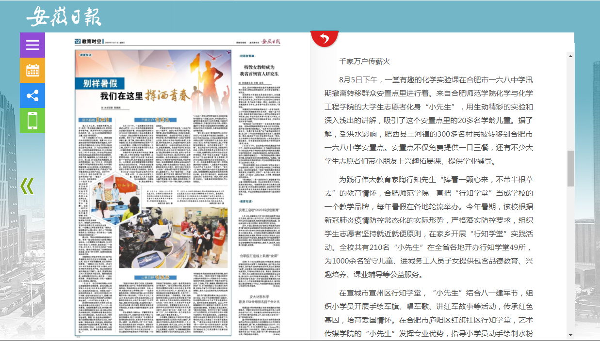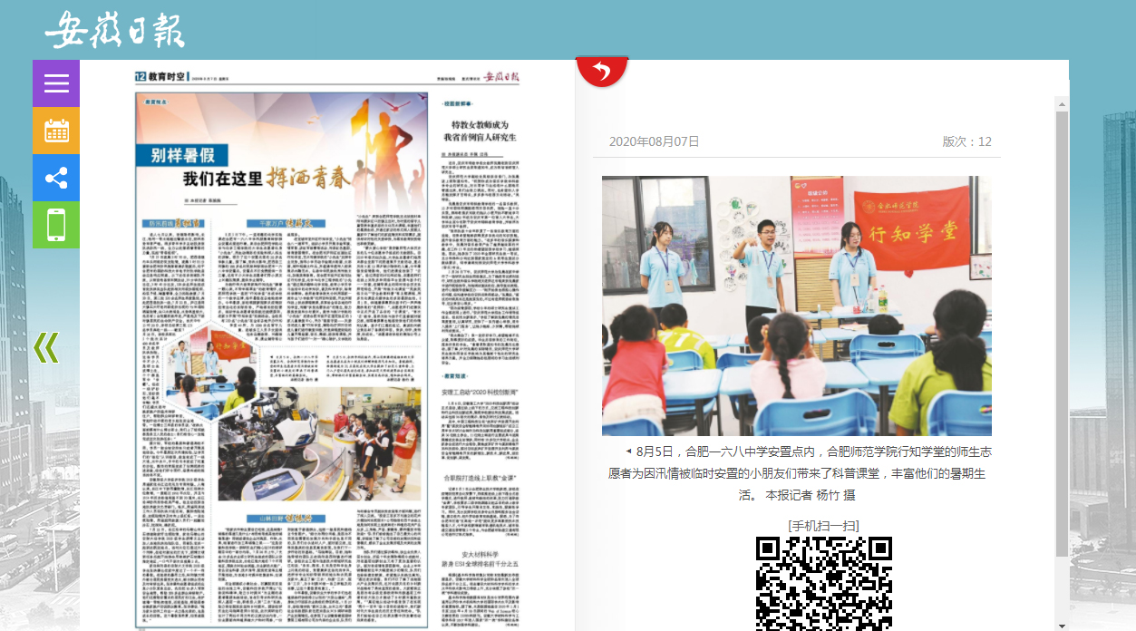 8月7日,安徽日报在第12版专题报道《别样暑假我们在这里挥洒青春》中,配发图文对我校2020年暑期“行知学堂”实践活动进行了全面报道。(校团委)