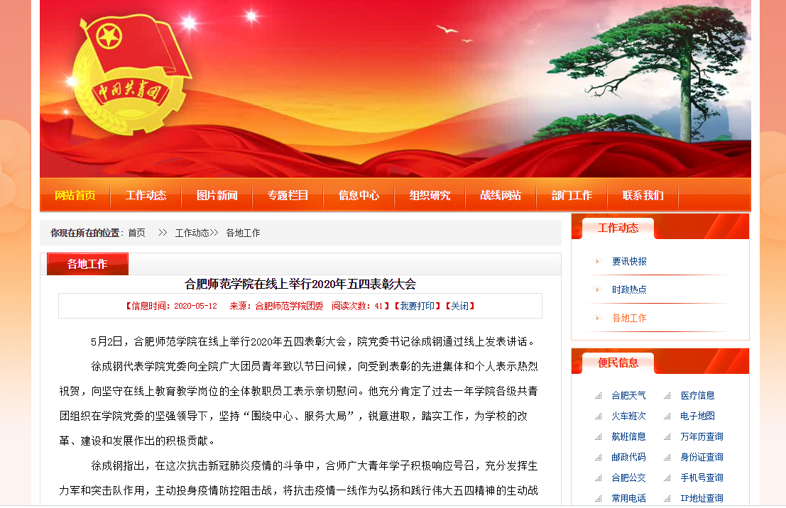 本网讯 5月12日,共青团安徽省委官方门户网站安徽共青团网对我院在线上举行2020年五四表彰大会情况进行了报道。(院团委)