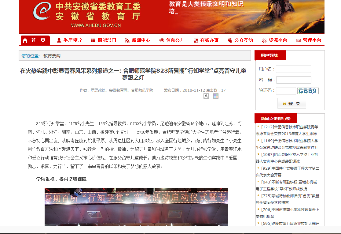 本网讯 11月12日,省委教育工委、省教育厅门户网站安徽教育网在“教育要闻”栏目头条以《在火热实践中彰显青春风采系列报道之一: beat365唯一官方网站823所暑期“行知学堂”点亮留守儿童梦想之灯》为题,深度报道我院2018年暑期“行知学堂”实践活动。(院团委)