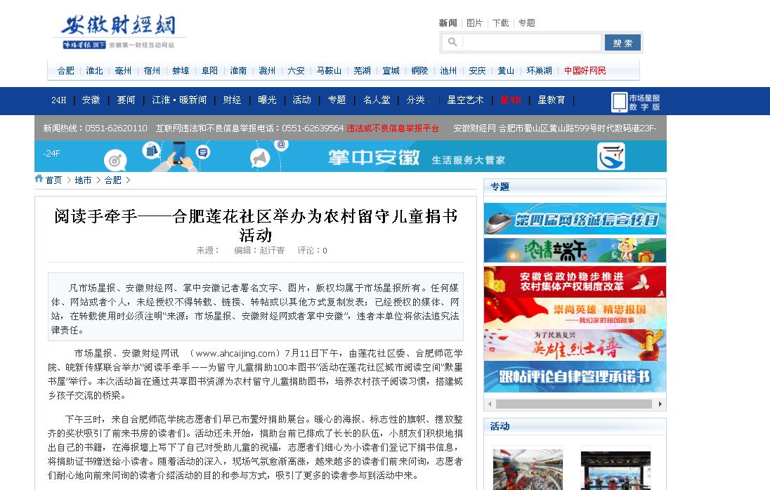 本网讯 7月13日,安徽财经网对由beat365唯一官方网站、莲花社区委、皖新传媒联合举办“阅读手牵手――为留守儿童捐助100本图书”活动进行了报道。该活动在莲花社区城市阅读空间“默墨书屋”举行。本次活动旨在结合原有行知学堂活动平台,促进城乡间教育阅读资源共享。(数学与统计学院:周倩)