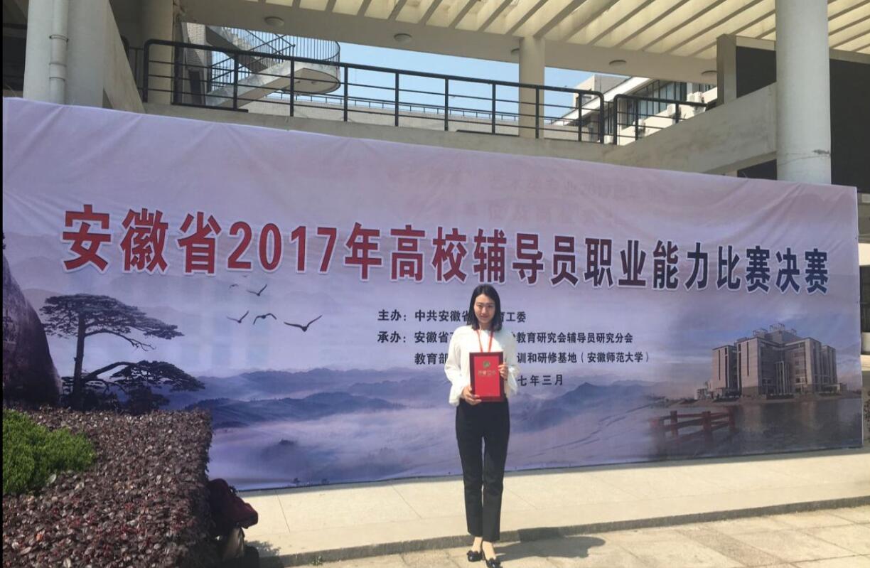 3月24日至26日,由中共安徽省委教育工委主办,安徽省高校思想政治教育研究会辅导员研究分会、教育部高校辅导员培训和研修基地承办的安徽省2017年高校辅导员职业能力比赛决赛在安徽师范大学举行。经过激烈角逐,我校辅导员曹晓旭获得大赛一等奖,并将代表安徽省参加全国高校辅导员职业能力大赛第六赛区复赛。