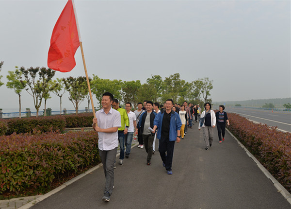 走出快乐,走出健康,走向青春。上午5时30分,天刚刚放亮,全体辅导员已经集合完毕,在锦绣校区东门整装待发。5时50分,随着纪委书记汤增产的一声令下“出发!”全体成员乘车前往滨湖湿地公园附近。到达目的地后,在校领导的带领下,辅导员们迎着清晨的第一缕阳光,高举着辅导员协会的会旗,开始了徒步环湖的旅程。大家迎着微微清风,带着满脸灿烂的笑容,迈着轻快的步伐,沿着风景如画的环湖大道井然有序地前进。五月的清晨,骄阳初升,晨风拂面,处处鸟语花香;万顷巢湖,碧波荡漾,踏途寻梦,人人斗志昂扬。一路上,校领导与年轻人们谈工作、聊生活、话成长,大家肺里呼吸的是清晨新鲜的空气,眼中看到的是巢湖美丽的风景,耳边回荡的是合师人欢快的笑语。
