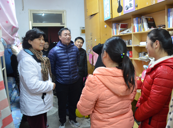 随后,汪敏一行来到学生公寓,与同学们拉起家常,“生活怎么样?考试准备的好不好?回家的车票买好了没?”。在得知同学们已定好返程票,并认真准备期末考试时,汪敏非常高兴,希望同学们扎实复习,诚信考试,争取优异成绩,高高兴兴回家过年。同学们对汪书记的关心和问候表示感谢,他们感动地说:“汪书记冒着严寒在深夜还来看望我们,大家很受鼓舞,一定会在期末考试中以优异的成绩回报领导和老师的期望。”