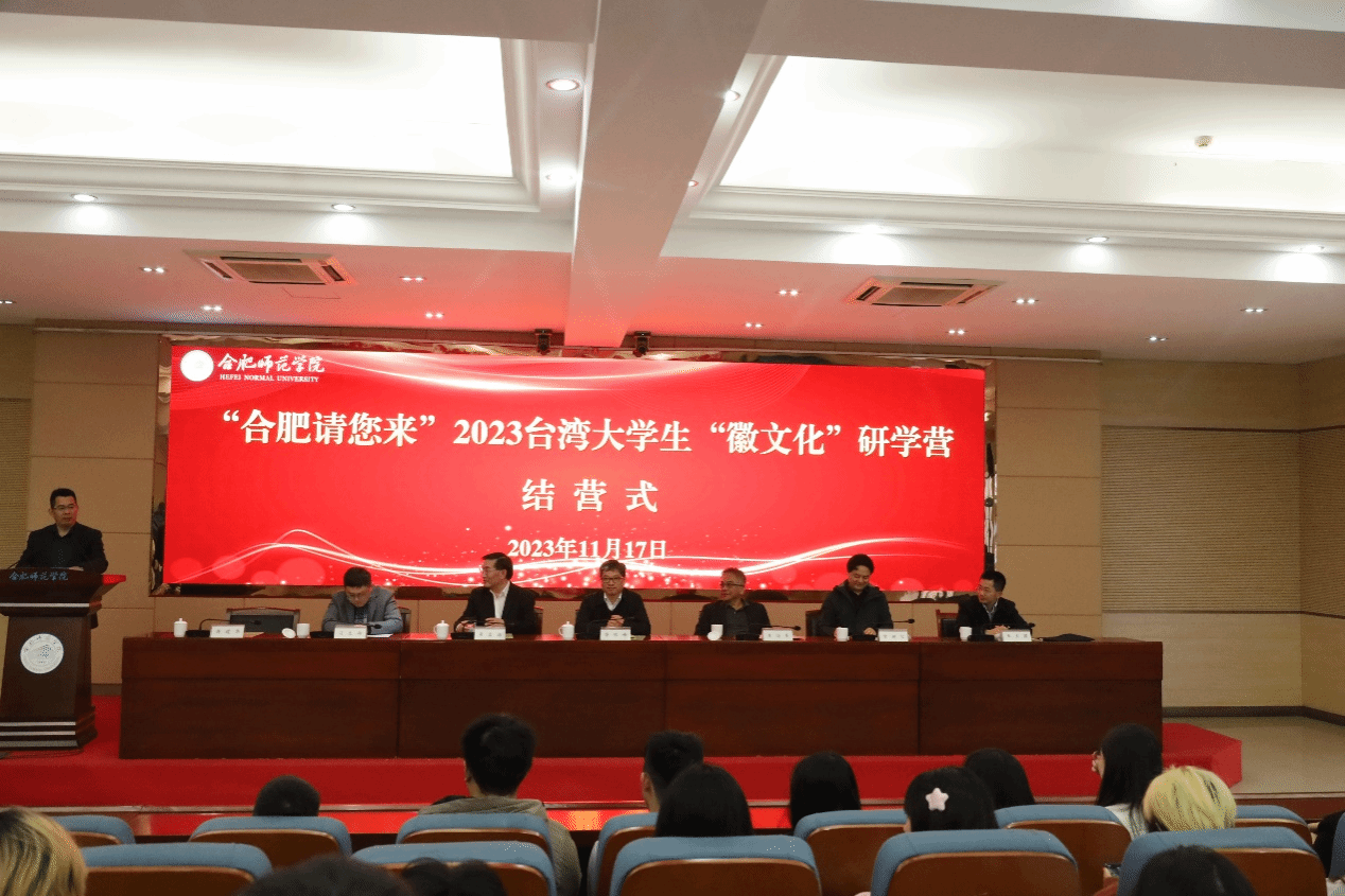 11月17日下午,“合肥请您来”2023台湾大学生“徽文化”研学营结营仪式在beat365唯一官方网站(锦绣校区)学术报告厅举行。铭传大学金融科技学院院长李进生、社会科学院院长黄富源等26名师生,以及我院参营师生参加仪式。院党委委员、副院长华银峰,党委委员、宣传部部长常树宝,相关部门负责人出席仪式。港澳台事务办公室负责人主持结营式。