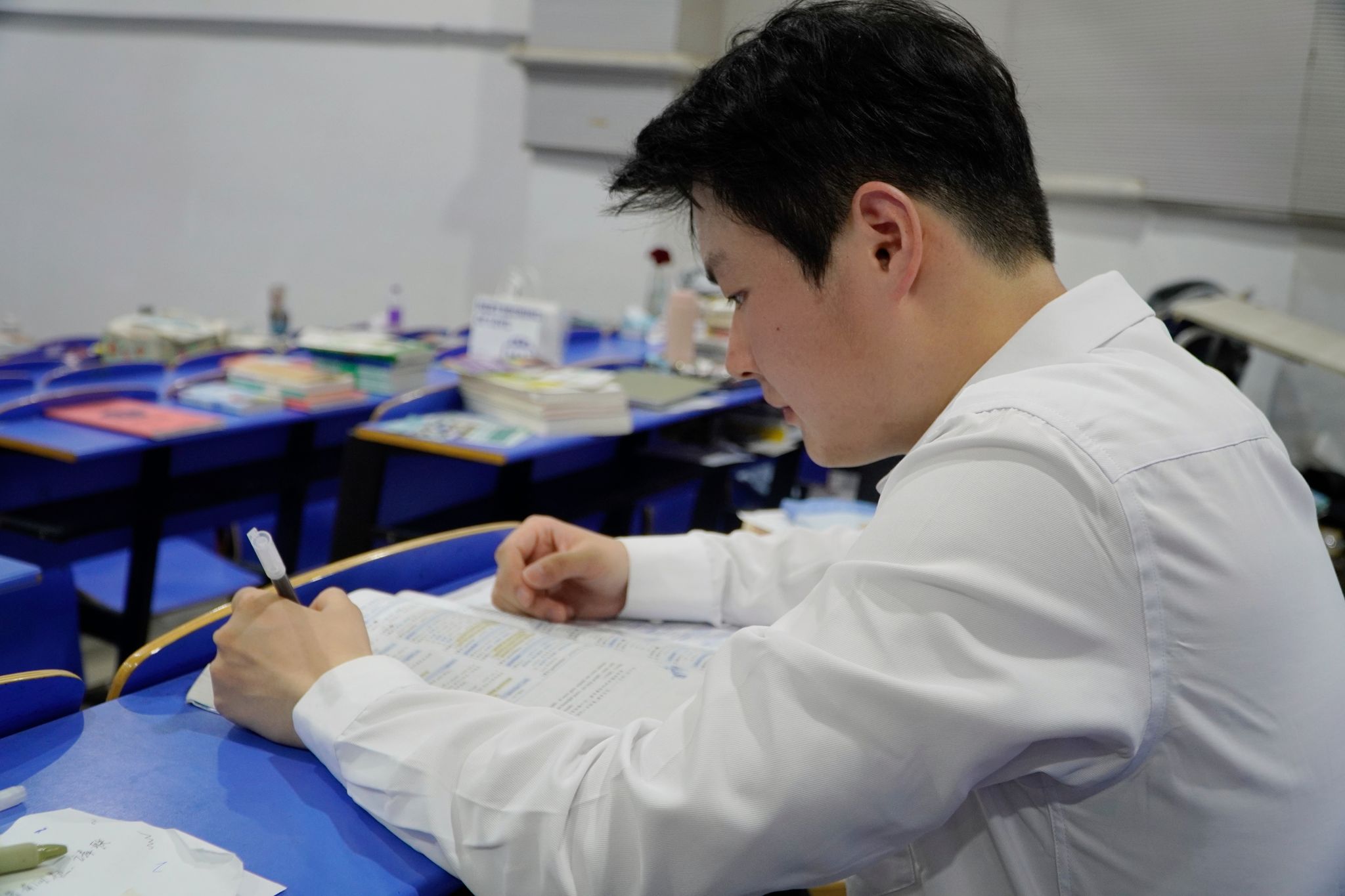 辅导员郭棒得知此事后,经常勉励许程程“坚持肯定有回报”,并同他一起商量对策,调整复习计划,在考试中适当放弃一些部分,比如英语作文需要用左手写,针对它的练习就选择放弃;政治复习以选择题为主,力保选择题的正确率;写的最少、也是最拿手的数学、专业课要全力冲刺......