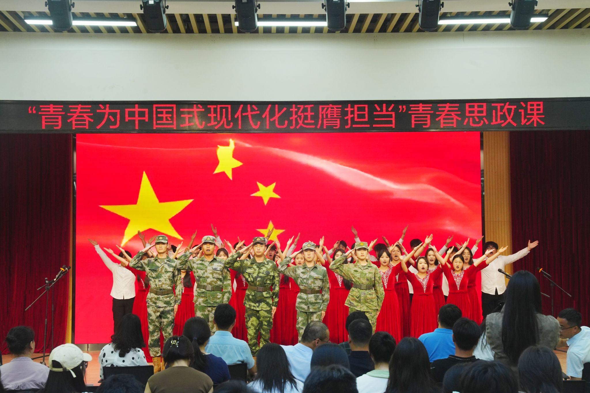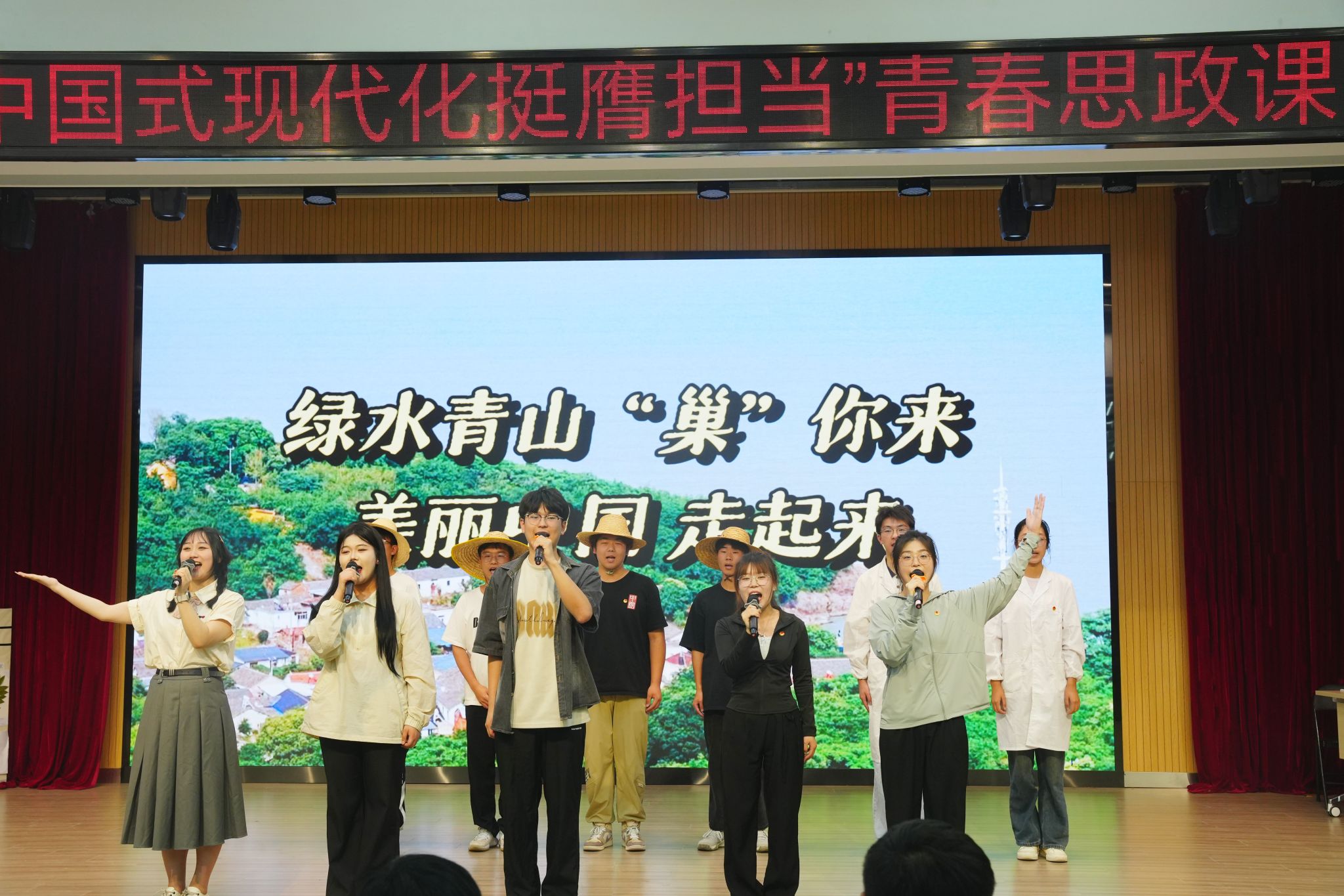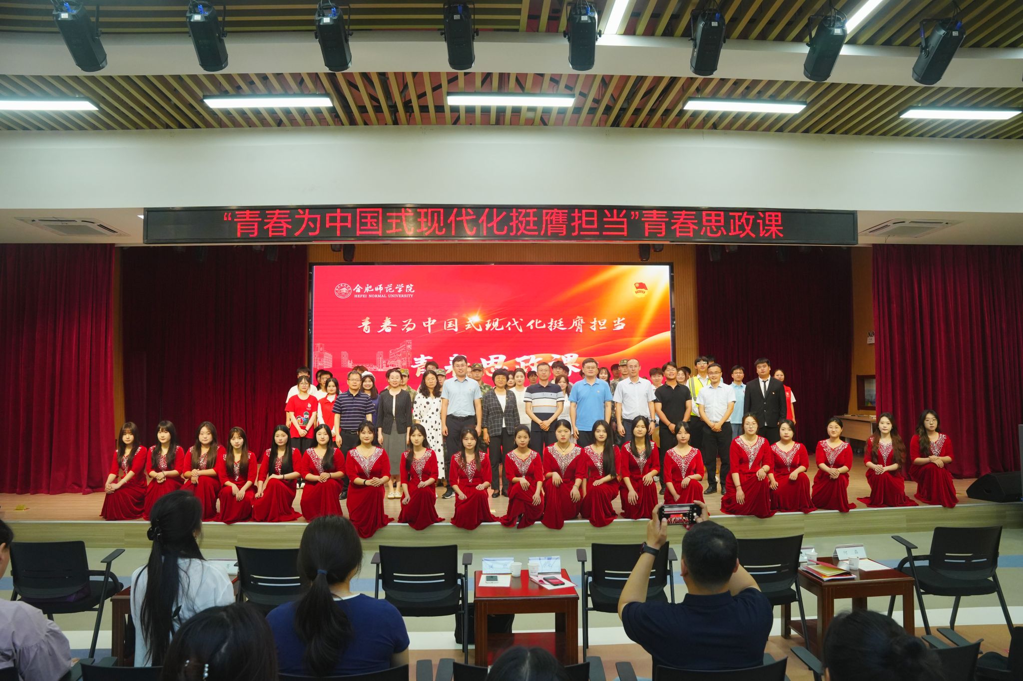 青春思政课聚焦合师青年在科技创新、乡村振兴、绿色发展、社会服务、卫国戍边等各领域各方面发光发热的生动事迹展开。教育部全国高校辅导员名师工作室负责人、电子信息与集成电路学院辅导员周玉老师及其团队带来的《青春筑梦,科创报国》以朗诵的形式讲述了合师学子众多奋战在科技创新创业竞赛一线的事迹,展现了合师师生勇攀科技创新高峰、服务科技强省建设的青春风貌。院团委带来的情景剧《到祖国和人民最需要的地方去》通过讲述合师青年志愿者的故事,将新时代青年脚踏实地、拼搏奋斗的青春风貌生动展现,合师青年志愿者的身影会走遍祖国和人民需要的每一个地方,新时代青年要将青春播撒在强国建设、民族复兴的征程上。由音乐学院教师江楠担任主持人,学院驻村干部李万成、学院毕业生、现在长丰马郢从事乡创客工作的省青联委员吕世强校友担任嘉宾,带来的节目《我的青春在乡村》,以访谈的形式展现了青年在乡村全面振兴的大舞台上播撒汗水、倾心耕耘的身影和农业现代化建设结出的硕果,呼吁新时代青年加入乡村,将自身追求融入祖国的大事业中。院团委原创情景剧《绿水青山“巢”你来,美丽中国走起来》,以学习宣传习近平生态文明思想为主线,生动演绎了学生社团绿色环保协会的同学们对“绿水青山就是金山银山”的积极讨论,展现了合师青年积极服务生态文明建设、踊跃投身绿色发展实践的青春风貌。由学生工作处和院团委一起带来的情景剧伴合唱《强军,有我!》,用铿锵有力的口号及整齐的队列训练展现了“退役不退志,退伍不褪色”的青春力量,青春思政课在满含家国情怀的《强军战歌》和《有我》合唱声中落下帷幕。