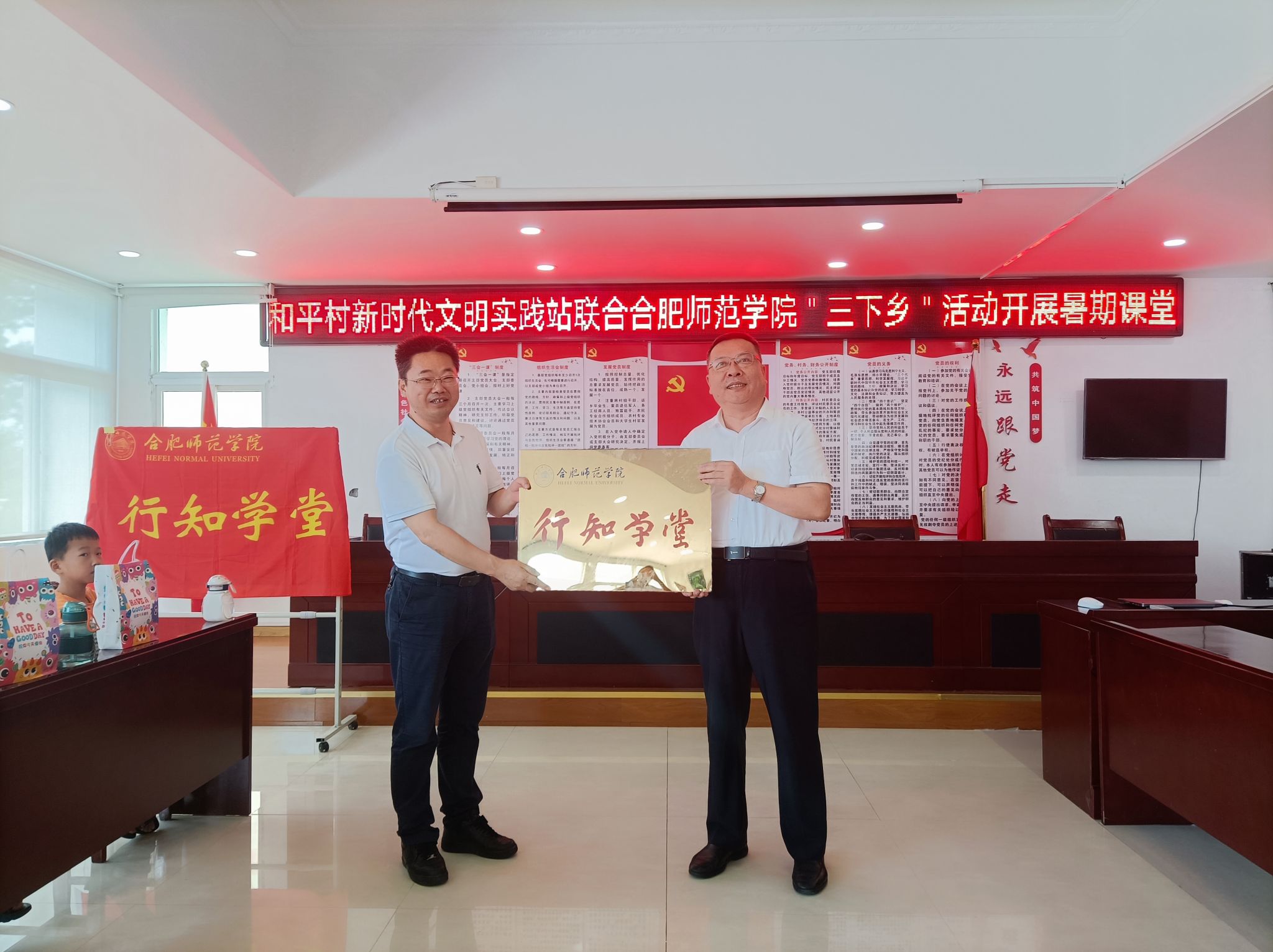 徐成钢还与胡四军共同为和平村“行知学堂”实践基地揭牌。