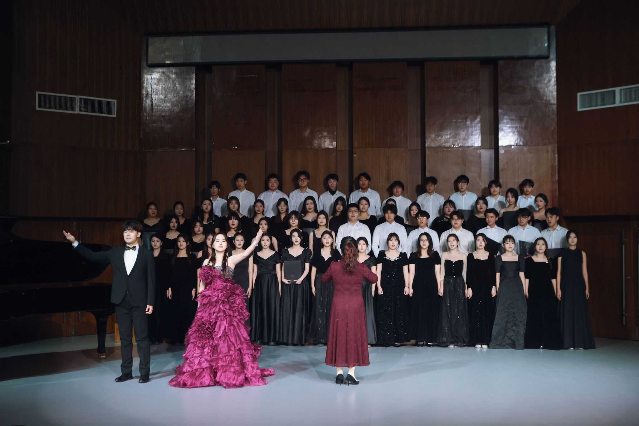 一代人有一代人的长征路。2025年是遵义会议召开90周年,也是大型声乐套曲《长征组歌》首演60周年。合唱《四渡赤水出奇兵》和《七律·长征》将红色经典与新思想相结合,展现了新时代青年对红色文化的传承与发扬。双钢琴演奏《黄河颂》中叶蕾与蒋睿青老师的精湛技艺,将观众带入激昂的音乐世界。女声独唱《帕米尔,我的家乡多么美》由鲁泉滢同学深情演唱,打动人心。晚会的最后,龙飞老师与蒋依宁同学的演唱,将《长江之歌》的豪情壮志展现得淋漓尽致,现场气氛瞬间推向高潮。