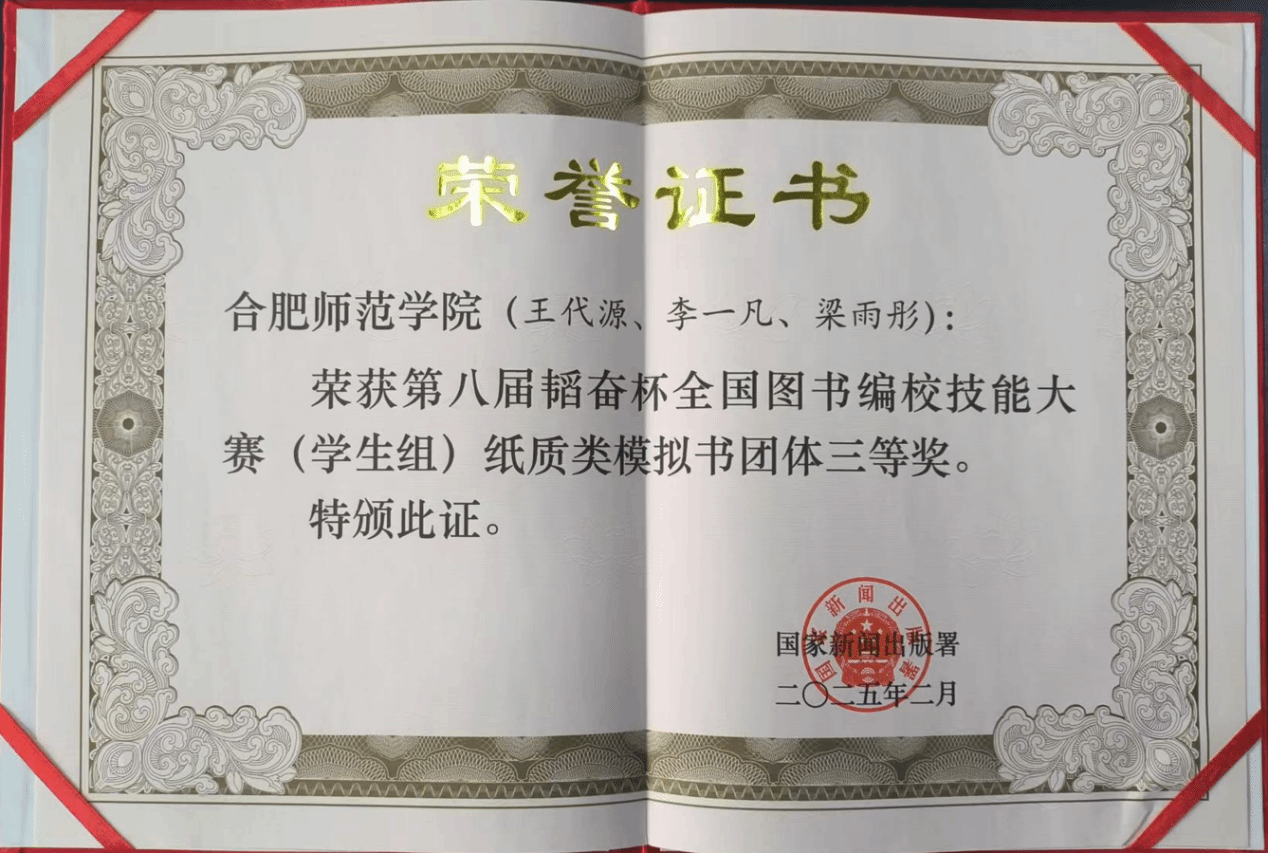 近日,国家新闻出版署发布《关于表彰第八届韬奋杯全国图书编校技能大赛获奖团队和选手的决定》(国新出发〔2025〕1号),公布了第八届韬奋杯全国图书编校技能大赛获奖结果。我校文学院学生王代源、李一凡以及美术与设计学院梁雨彤组成的团队提交的作品《笔梦宣州》从中国传媒大学、武汉大学、南京大学等全国60余所高校、3000余名本科生和研究生、提交的1000余件作品中脱颖而出,荣获大赛学生组纸质模拟书类别三等奖,是本次唯一获奖的安徽省高校。此次获奖也是文学院学子继2020年之后,再次荣获该项赛事的全国三等奖。
