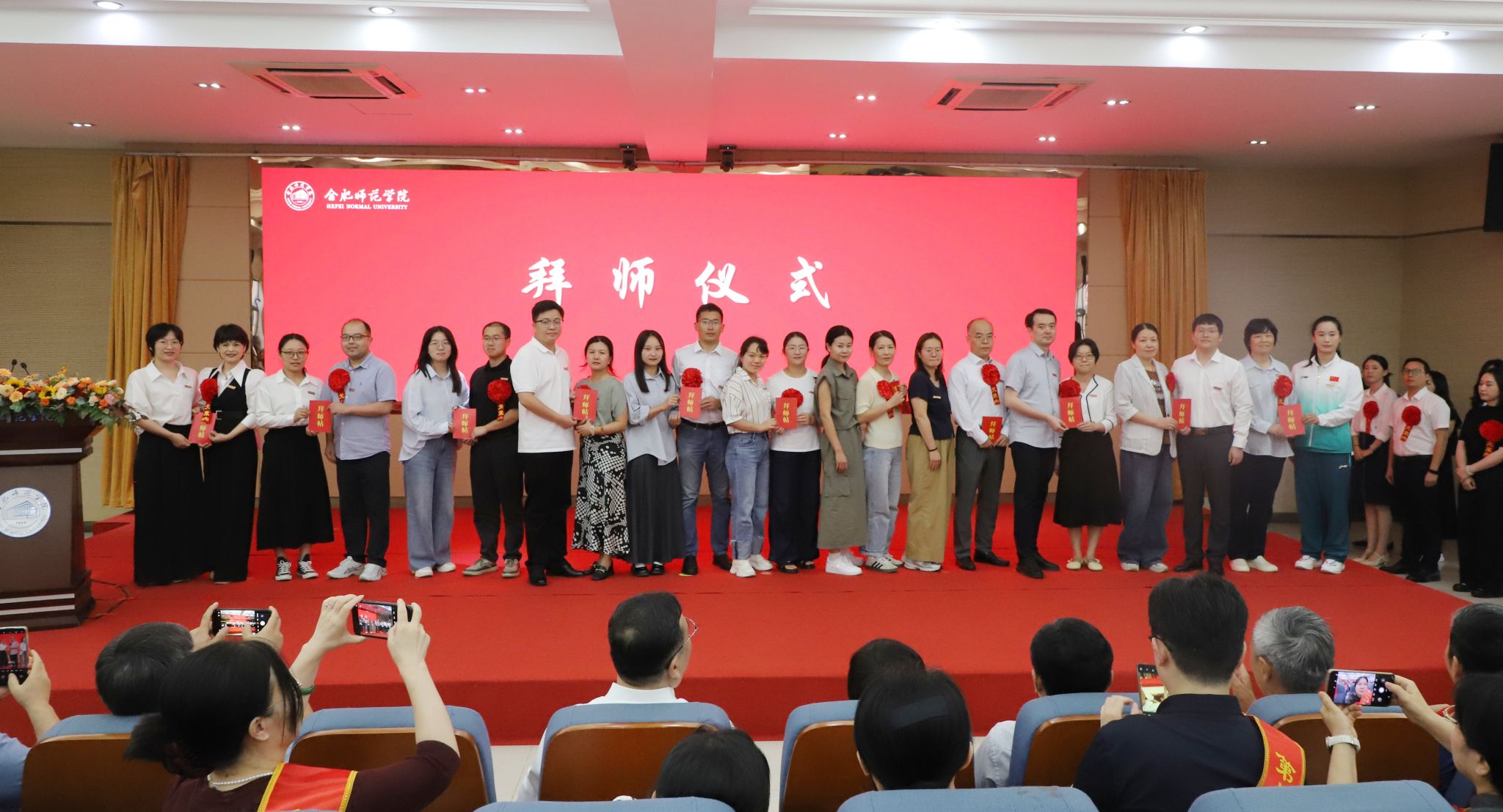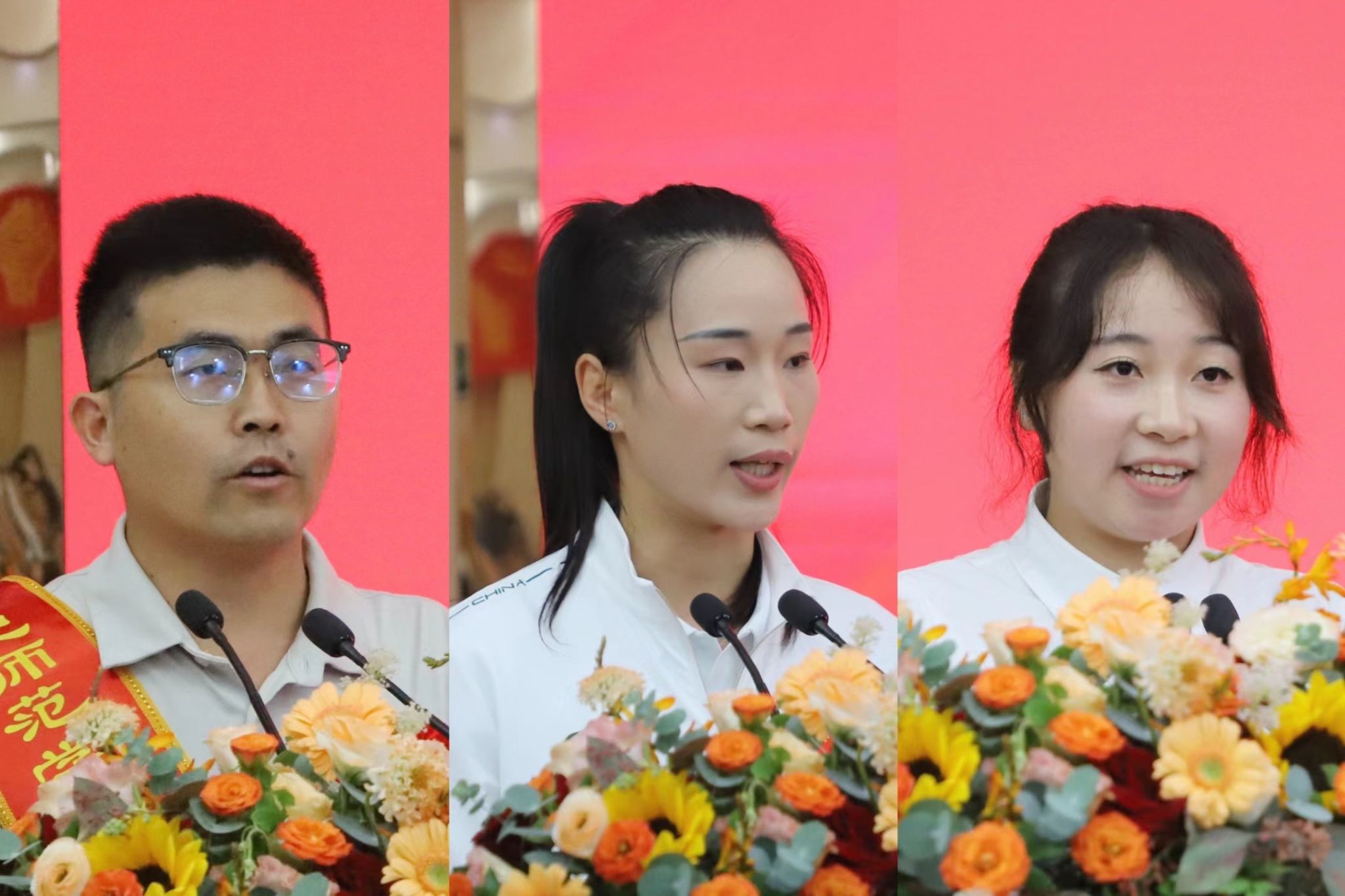 第二篇章为传承篇。2025年新入职教师80余人进行了庄严的入职宣誓。青年教师向导师代表敬献拜师帖并合影留念。新进教师代表、世界运动会冠军、体育科学学院李志勤老师作为教师代表发言,表达了对学院灵活的人才政策的感谢,以及入职不久斩获世界运动会冠军为学院事业发展贡献力量的骄傲!