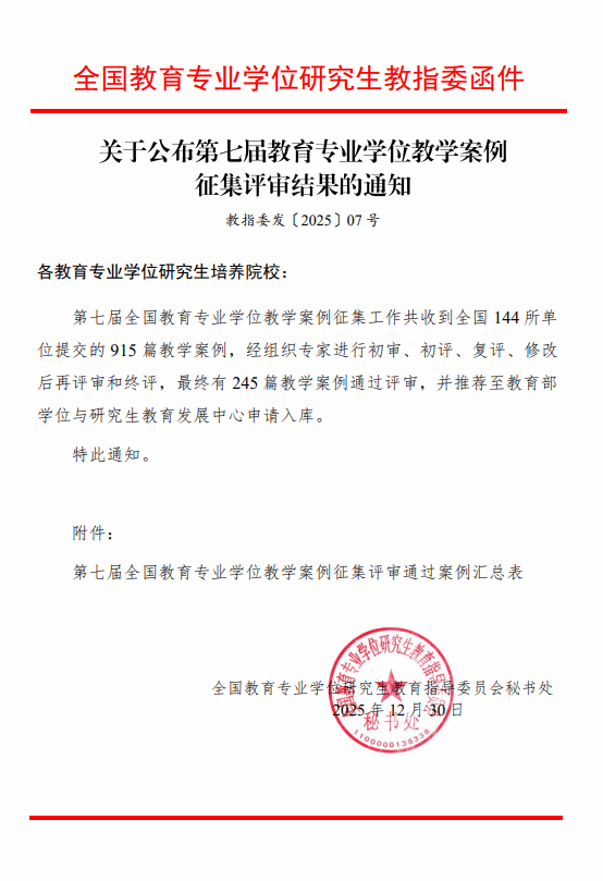 教学案例入选中国专业学位教学案例中心案例库情况是专业学位授权审核与评估的一项重要考核指标,代表着专业学位案例建设的最高水平。学校一直高度重视专业学位教学案例建设工作,持续加大对教学案例的培育和支持力度,此次教学案例入库既是我校开展教学案例建设工作取得的新成效,也是对我校专业学位研究生教学改革与实践工作的充分肯定。今后我们将以此为契机,继续深化教育教学改革,鼓励更多教师参与案例开发与应用,打造更多高质量的精品案例。同时充分发挥入选案例的示范引领作用,加强优秀案例资源的培育、推广和应用工作,持续推动专业学位研究生教学实践与改革取得新成效。