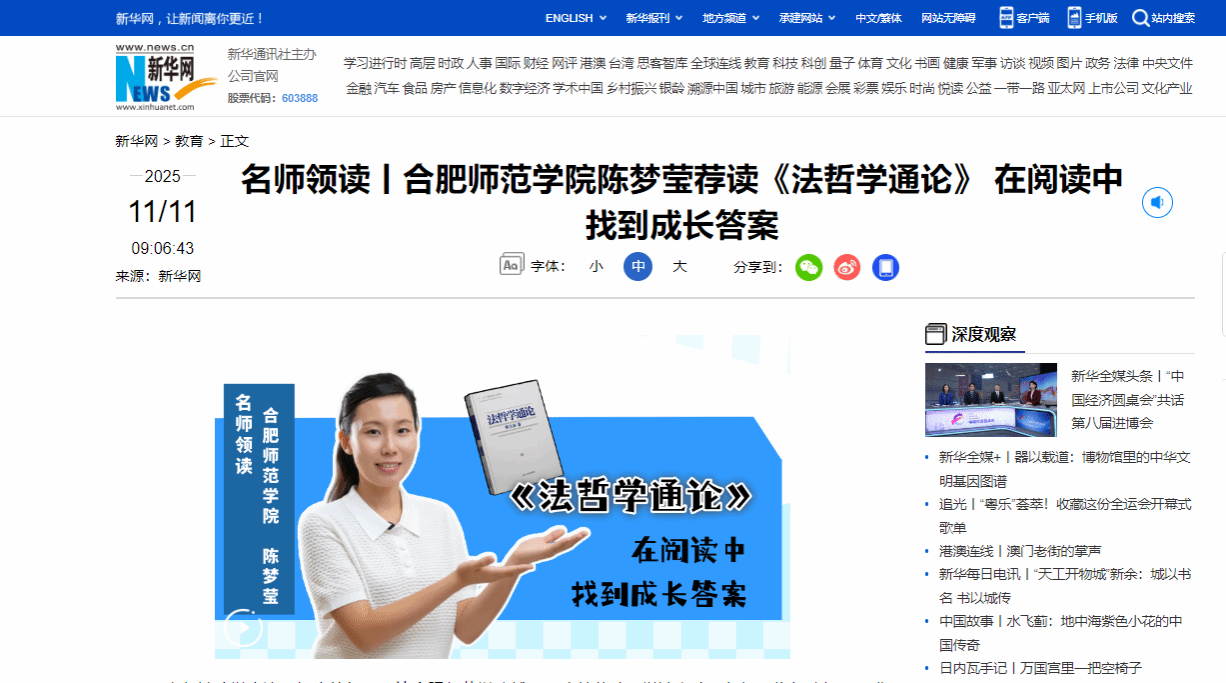 名师领读微课,做网络思政的“引路人”。11月,我校辅导员陈梦莹受到教育部思政司邀约,录制“书香同行 阅读青春”名师领读微课,深度解读《法哲学通论》,引导学生在“硬核阅读”中沉淀智慧、坚定信念。该课程在新华网、新华网客户端及新华网教育频道同步上线,总浏览量300余万。这是我校深化书香校园建设、创新网络思政载体的有效举措。