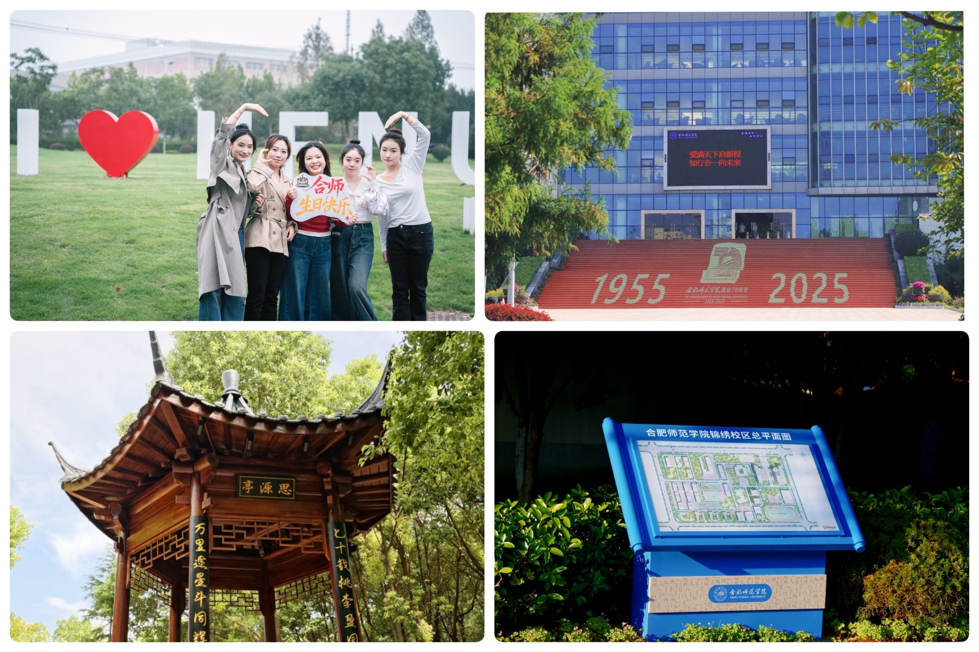 于细节处见温情,打造沉浸式校庆文化场景。学校注重以环境育人,于细节处营造浓郁、温馨的校庆文化场景。在锦绣校区北门草坪,设立“我爱合师”主题雕塑,使其成为凝聚情感、备受师生校友喜爱的打卡地标。上海校友联谊会为母校捐建的校园文化景观“思源亭”,不仅是校友饮水思源、情系母校的实体象征,更为校园增添了深厚的人文意蕴。全面优化校园导视系统,将合师文化元素融入校园导视地图、路牌设计,图书馆楼梯换上“校庆装”,让回家温馨的氛围浸润校园角落。