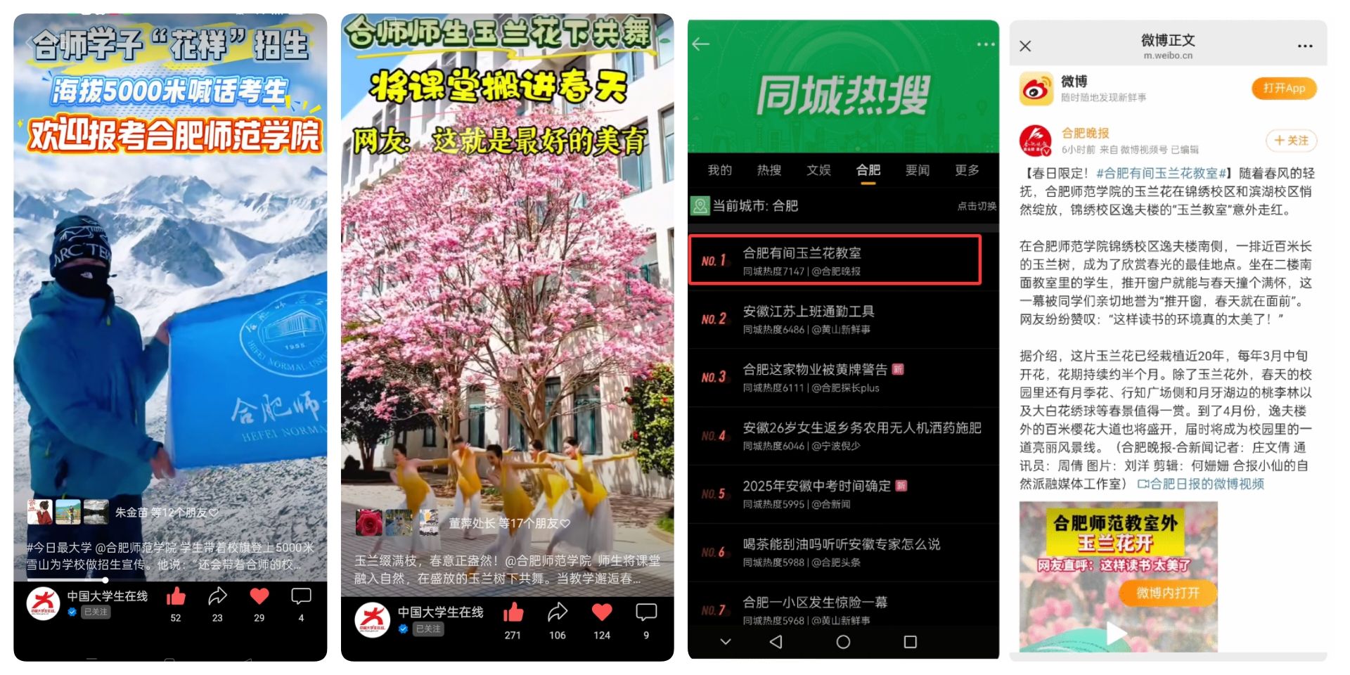 这一年,合师故事精彩纷呈。学子在海拔5000米雪山展开校旗宣传报考合师的视频单日浏览量破10万+,入选合肥年度温暖记忆;“合师玉兰”火爆全网,荣登同城热搜榜首,师生花下共舞成为美育生动写照。这些青春正能量与文化浸润,生动诠释了学校“五育并举”的育人成效,为社会培育德智体美劳全面发展的高素质人才写下动人注脚。