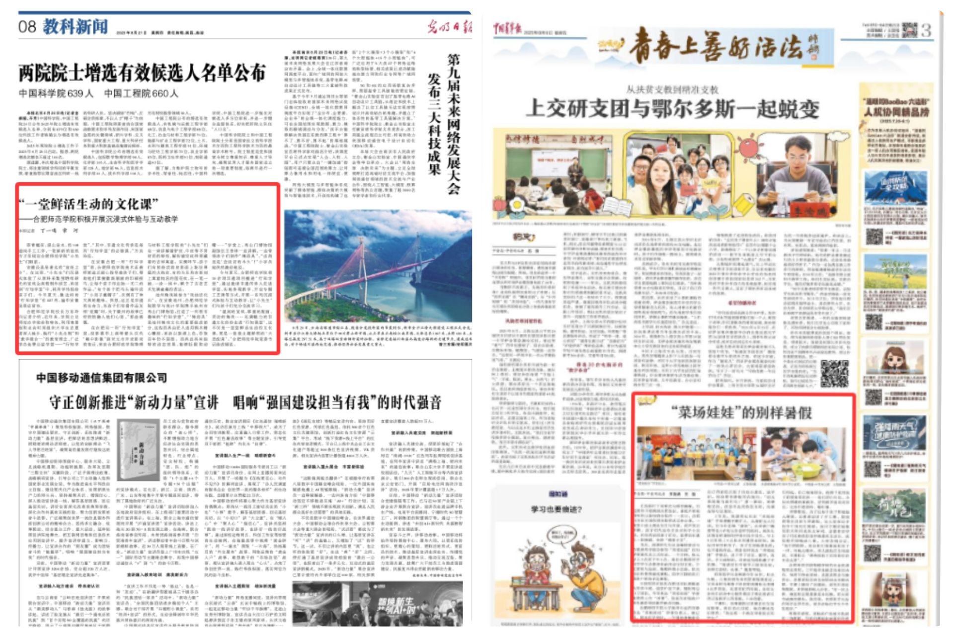 擦亮“行知学堂”金字招牌,打造鲜活生动文化课。2025年暑期,《光明日报》以《一堂鲜活生动的文化课》为题,深度报道了我校将宣纸制作、徽派版画、皮影戏、池州傩戏等10余项非遗项目融入“行知学堂”的生动实践。这堂“鲜活的文化课”不仅是对学校十三年来坚持践行行知教育思想的精彩注脚,更映射出学校以文化人、以文育人的深厚底蕴与创新探索。