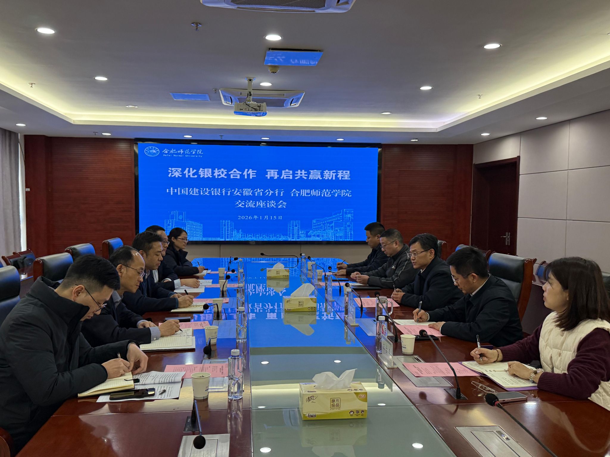 座谈会上,中国银行安徽省分行与中国建设银行安徽省分行均表示,高度重视与学校建立长期、稳定的合作关系,并充分发挥各自银行在金融服务、科技创新等方面的优势,持续为学校在综合授信、数字校园建设、产学研融合及教工金融服务等领域提供全方位、多层次的支持,推动银校合作从“基础服务”向“战略协同”升级,助力学校高质量发展。