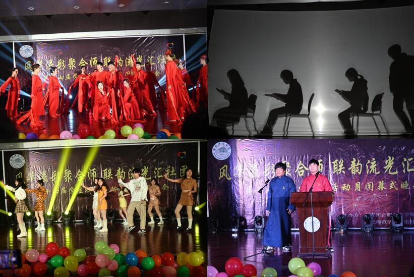 晚会以“风华溢彩聚合师,联韵流光汇社团”为主题正式拉开序幕。青春热血在这里挥洒,年轻的心在这里碰撞,各个社团大显身手——大学生艺术社团的舞蹈《东方红》生动形象的展示了中华民族艰苦卓绝的奋斗史,直击人心;思乡绵绵,情谊浓浓,梨花雨读书社表演的幕布剧《家,永远的港湾》为我们的内心带来宁静,为漂泊的灵魂带来抚慰;羽毛球协会的Kpop舞蹈《I can't stop me》用炙热的舞姿流露语言无法表达的情感,成功点燃现场氛围;文艺赏馨曲艺社表演的相声《校园生活》生动活泼,令在场的观众捧腹大笑;沧海桑田,千秋星河,满腔赤诚为利剑,艺韵音乐社带来的歌曲《千秋令》告诉我们春风比肩,何惧向人间……一共10个各具特色的节目组成晚会,现场座无虚席,台上社团成员们挥洒汗水,台下观众们回应以热烈的掌声。