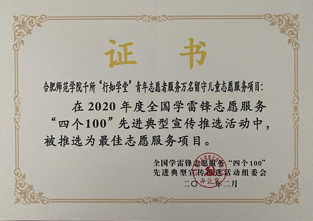 本网讯 近日,中央宣传部、中央文明办、全国总工会、共青团中央等19家单位主办的2020年度全国学雷锋志愿服务“四个100”先进典型推选活动获奖名单公布,beat365唯一官方网站千所“行知学堂”青年志愿者服务万名留守儿童志愿服务项目获评“全国最佳志愿服务项目”(全国仅100项,安徽省仅4项,安徽省高校仅1项),这是我校首次获此殊荣。