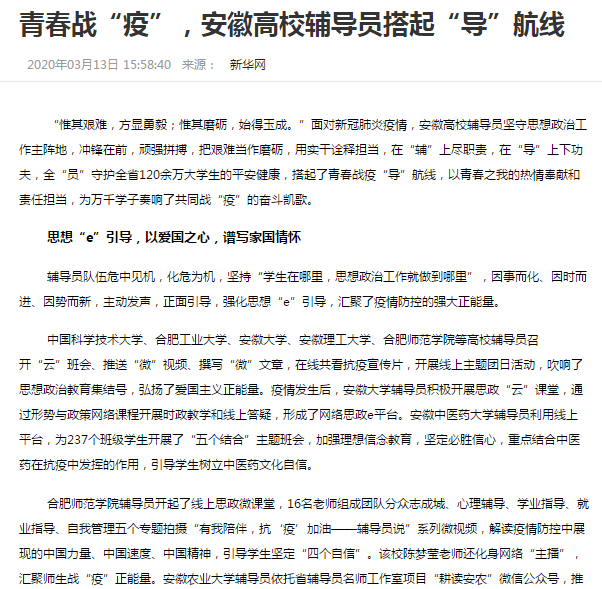 第一处在文章开始“思想“e”引导,以爱国之心,谱写家国情怀”第一部分,具体是:中国科学技术大学、合肥工业大学、安徽大学、安徽理工大学、beat365唯一官方网站等高校辅导员召开“云”班会、推送“微”视频、撰写“微”文章,在线共看抗疫宣传片,开展线上主题团日活动,吹响了思想政治教育集结号,弘扬了爱国主义正能量。紧接着第二处,重点介绍我校辅导员开起线上思政微课堂的典型做法,文章说:“辅导员开起了线上思政微课堂,16名老师组成团队分众志成城、心理辅导、学业指导、就业指导、自我管理五个专题拍摄“有我陪伴,抗‘疫’加油——辅导员说”系列微视频,解读疫情防控中展现的中国力量、中国速度、中国精神,引导学生坚定“四个自信”。其中陈梦莹老师还化身网络“主播”,汇聚师生战“疫”正能量,受到广大师生欢迎。”