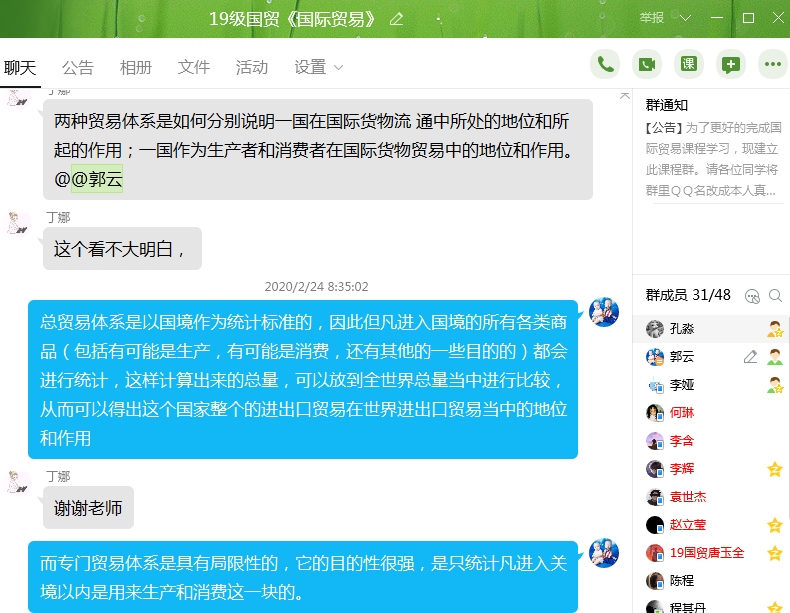 为适应线上教学的要求,我在课前做了大量的准备工作,精心设计课程内容,并克服了诸多问题,如“超星学习通”平台操作不熟悉、原有教学设计不适合线上教学特点、课程线上资料不丰富等。为此,在开课前我认真学习了“超星学习通”平台操作技巧,并提前和学生沟通测试平台效果,以确保课程的顺利进行。同时,根据《国际贸易》课程每部分不同教学内容的特点,进一步细化了在线教学任务内容,并通过提供相关阅读教材、期刊、网络短视频资料等内容来丰富学生知识的广度和深度。考虑到《国际贸易》课程是在每周一上午开课,网络可能拥堵,故提前录制了相关教学视频。同时,为了加强交流,设立了QQ课程群,以确保线上教学整体效果。