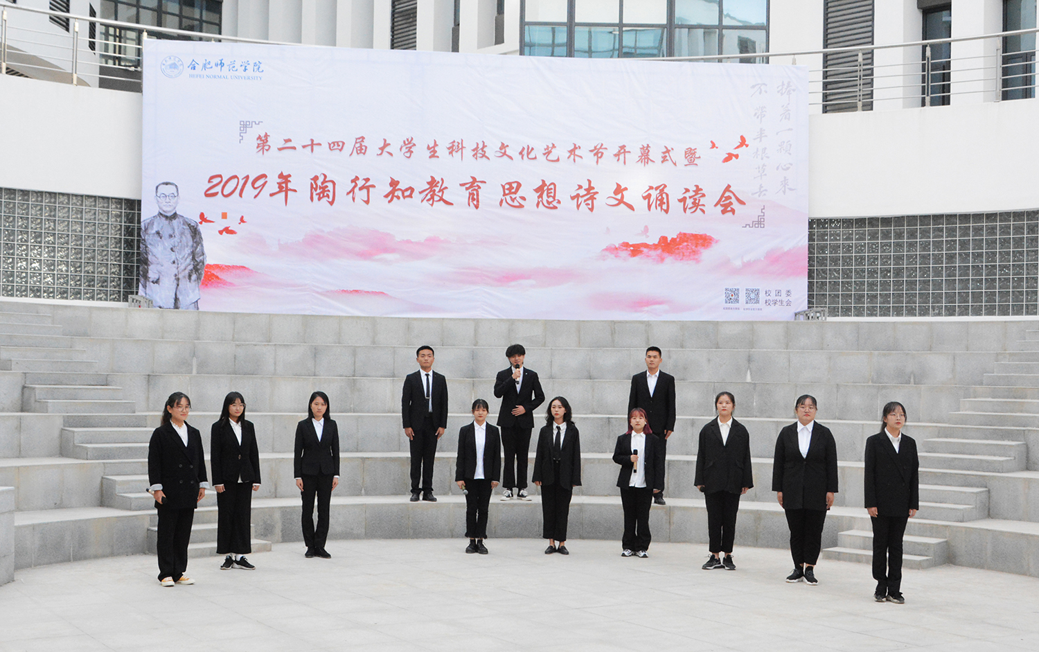 随后,陶行知教育思想诗文诵读会正式拉开帷幕。文学院声情并茂地朗诵了《知之始,行之成》,深情地歌颂了陶行知先生将毕生献给平民教育事业,矢志投身教育救国的爱国热情。经济与管理学院的《爱传经管,行知天下》慷慨激昂,并结合手语舞《感恩的心》,表达了合师学子在新时代传承行知精神、热爱伟大祖国的决心。电子信息与电气工程学院、数学与统计学院的《行知韵》声音铿锵富有感染力,让人仿佛穿越时空,听到了当年晓庄师范朗朗的读书声。生命科学学院、化学与化学工程学院的《师德馨香,春暖花开》声音悠扬动听,娓娓道来陶行知先生“甘为骆驼、乐育英才”的师德精神。艺术传媒学院、外国语学院、物理与材料工程学院、计算机学院的《行知中华,爱满天下》歌颂了陶行知先生作为伟大的人民教育家无保留地追随中国共产党,为劳苦大众能够接受平等的教育机会而殚精竭虑的大爱情怀。院团委的《四季行知》以春夏秋冬四季变幻为题,讲述了合师学子初心不改,弘扬行知精神,投身“学陶师陶”,开办行知学堂,始终如一的无悔坚守。院广播台的《创造宣言节选》用富有磁性的声音展示了陶行知生活教育思想的魅力,激发同学们争做创新人才,为国奉献的信念。诵读会在音乐学院、教师教育学院同学带来的“行知学堂”原创主题曲《爱的行知》感人的歌声中落下帷幕。