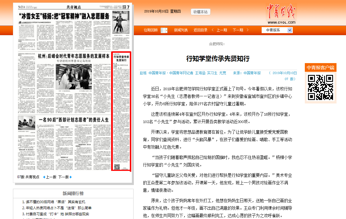 今年暑期“三下乡”暨“行知学堂”实践活动在全院上下共同支持和推进下,又取得了新的突破。学院首次一次性获评5支全国暑期“三下乡”社会实践活动重点团队,创造新的历史;还获批2支全省重点专项团队。《中国青年报》首次对“行知学堂”实践活动进行了报道,此外人民网、新华网、人民日报网、中国青年网、中国新闻网、安徽日报、安徽商报、合肥日报、中安在线、安徽新闻网、安徽青年网、安徽教育网、中华全国学联微信号、安徽学联微信号等多家主流媒体累计报道100余次。“行知学堂留守儿童关爱帮扶计划”荣获第五届中国“互联网+”大学生创新创业大赛“青年红色筑梦之旅”赛道银奖和安徽省金奖,进一步彰显了“行知学堂”实践活动的品牌效应。