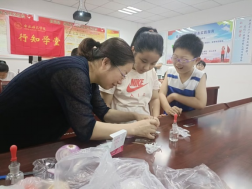 社员、副教授朱小红与小学员们一起探索生活中化学,她从孩子们喝的汽水、吃的老面馒头、冷藏食品和人工降雨用的干冰、灭火用的灭火器等身边的事物引入二氧化碳的神奇作用。通过“泡沫喷泉”和“瓶子吹气球”两个有趣的化学小实验,让孩子们自己动手操作,充分感受化学神奇的魅力,激发了同学们的科学热情。