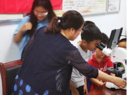 社员、高级实验师耿明带领小学员们走进奇妙的微观世界。首先,她通过播放一段视频,让小学员们直观地了解微观世界。随后,耿明用牙签从一位小朋友的口中提取口腔上皮细胞并做成标本,孩子们在显微镜下观察口腔上皮细胞,耿明还和小朋友们一起用酵母菌溶液和洋葱切片制作标本。活动激发了小朋友们对微观世界的探索欲。