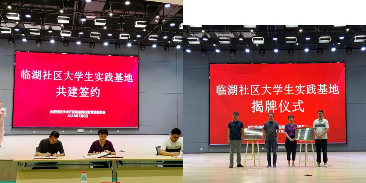 本网讯 为深入开展学习贯彻习近平新时代中国特色社会主义思想主题教育,全面推进学院应用型人才培养和实践育人工作,7月6日,物理与材料工程学院和临湖社区共建大学生社会实践基地签约揭牌仪式在临湖社区党群服务中心举行。beat365唯一官方网站物理与材料工程学院团委书记费文清、指导教师张玲俐,临湖社区党委副书记孟海峰、临湖社区党群服务中心主任周燕出席揭牌仪式,并签约大学生社会实践基地合作共建协议。