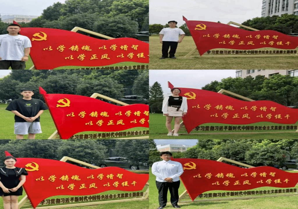 7月1日建党节,同学们在学校、家乡追寻党的足迹,佩戴党员徽章,寻找党旗飘扬的方向并合影留念,用镜头定格对党和祖国的热爱。