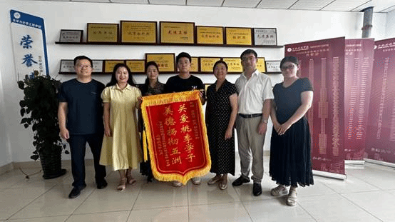 本网讯 6月20日下午,化学与制药工程学院2023届制药工程中爱合作专业毕业生,现已被中国药科大学录取为硕士研究生的马士腾同学和她的母亲,将写有“关爱桃李学子、美德扬彻五洲“的锦旗送到了学院,我院党委书记李红、副院长董雄辎、制药工程系主任郑斌等热情接待了学生及家长。