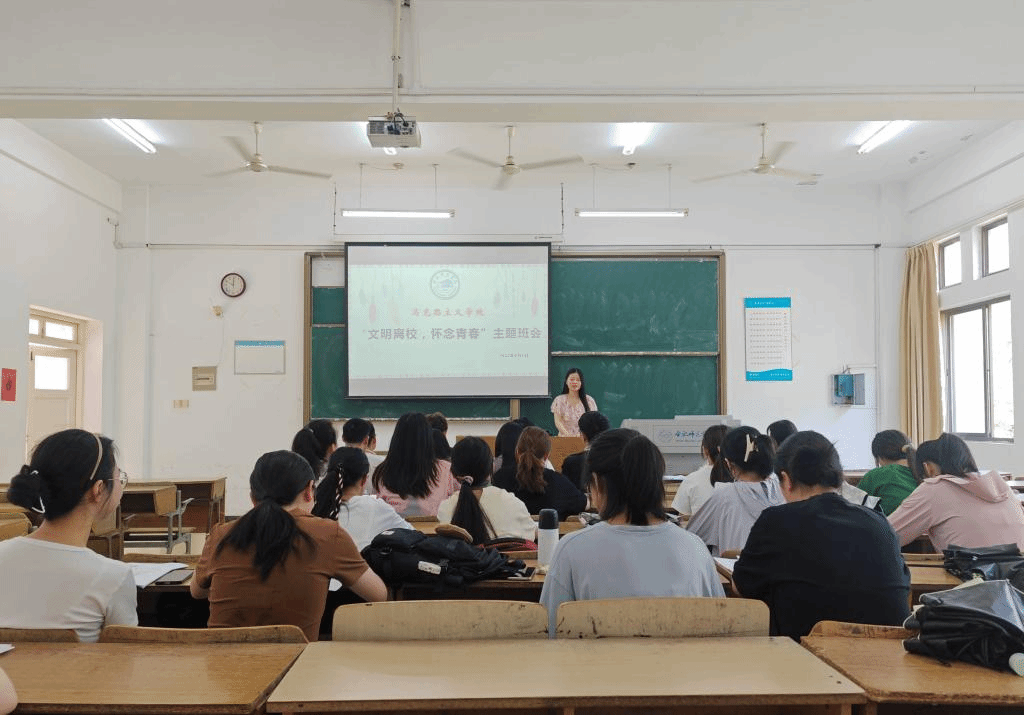 本网讯 一朝别离毕业季,正当扬帆远航时。马克思主义学院2023届毕业生即将带着学院的嘱托与期盼,奔赴祖国各地,开启新的征程。学院于6月9日上午在锦绣校区博约楼110教室开展毕业生文明离校主题班会活动,为毕业生上好最后一堂“离校班会课”。本次主题班会活动以“文明离校,怀念青春”为主题,由毕业班辅导员王萌主持,2019级思想政治教育班全体同学参加。
