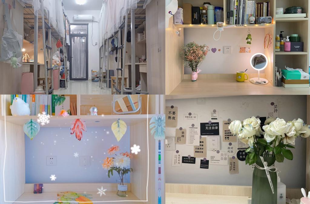 本次比赛的参赛寝室风格多元,创意独特。同学们精心布置的小角落,个性的艺术风格,无不彰显出对寝室环境美的向往。滨湖校区女生寝室三栋B326、B228、B216寝室采用精致的便利贴和贴画装饰书桌,既美观又充满趣味。