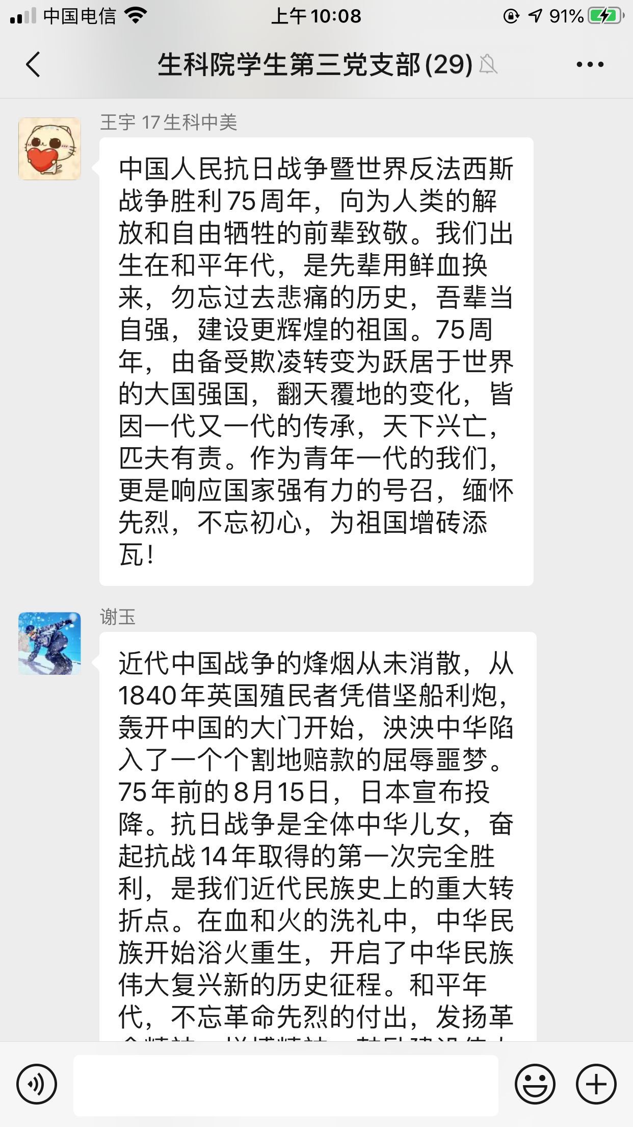 抗战胜利75周年,这不仅仅是纪念日,更是一段刻骨铭心的岁月,是中国人民强大精神力量的最好证明。山河无恙,致敬英雄。此次的学习,激发了支部党员的爱国情、强国志。他们表示,在今后的学习和工作中,将继续不忘初心、牢记使命,铭记历史、开创未来。(生命科学学院:李万成)