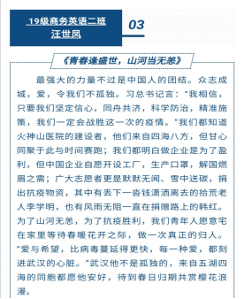 汪世凤同学写道:“他们在“以人为本”这条路上一直不忘初心、牢记使命。甚至有一种来自心底的感觉:中国在,我就安心;在中国,就是幸福。”深刻表达了我们对党和国家的信任。同时关于奔赴在前线的英雄们代雅青同学写道:“在公与私的天平上,你们毅然选择坚守防控一线。这就是一名普通基层医护人员,用自己的行动诠释初心与使命,用自己的付出彰显责任与担当。”体现出对前线医护人员的赞美与敬佩。