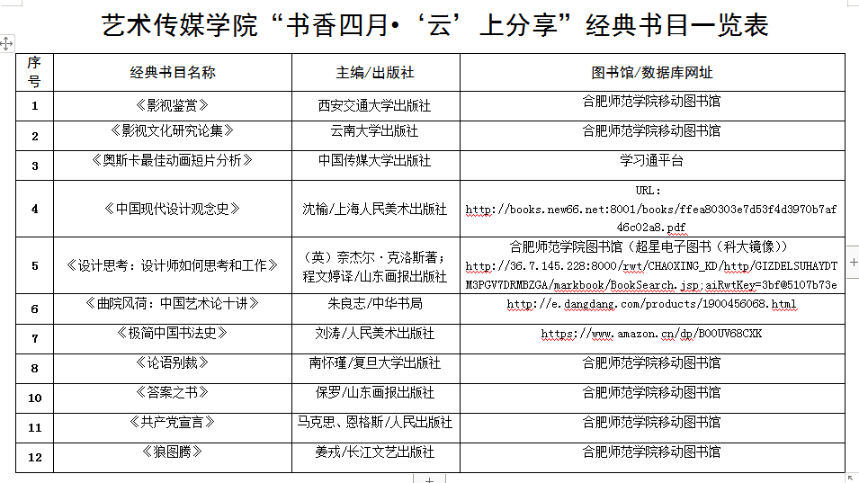 雅言传承文明,经典浸润人生。本次活动以“读好书、读经典”为主要内容,以“四结合”展开:一是活动形式以读书活动与主题党日相结合,二是推荐书目以教师推荐与学生自选书目阅读相结合,三是思政教育与专业精神教育提升相结合,四是线上阅读与“云”分享读书心得相结合。目前,专任教师和辅导员已为学生提供经典书目37本,后期再推由中宣部指导、中国图书评论学会评选的“2019年度中国好书”,共邀学生畅游线上书海,活动将持续至5月下旬,届时学院将对学生读书心得(读书随笔、读书故事)进行院级评选。(艺术传媒学院:李舒 朱宇迪)