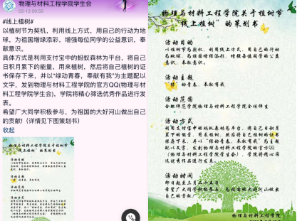 以植树节为契机,开展网络植树,鼓励同学们利用线上方式,用自己的行动为地球、为祖国增绿添彩,增强每位同学的公益意识和环保意识。