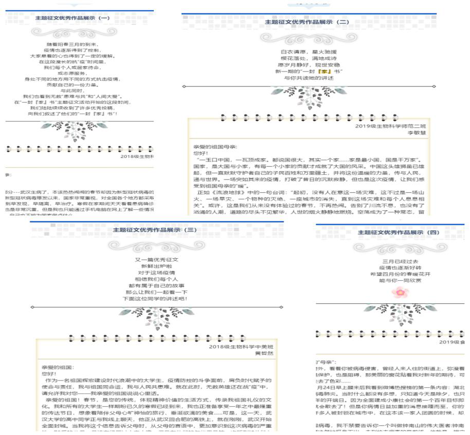 活动发起后,同学们积极响应号召,邮件纷沓而至,同学们把对祖国的祝愿和祈福写在信里,把感慨和感悟留在心里,纷纷表达战胜病毒、与祖国共患难、立志成才、报效祖国的决心。生命科学学院学生会微信公众号对优秀征文进行了展播,征文活动在同学们中引起了强烈的反响,同学们纷纷表示要时刻关注国家抗击疫情采取的新举措,学习在抗击疫情中涌现出的先进感人事迹,激发自己更加努力学习,用自己所学知识,为实现中华民族伟大复兴的中国梦而努力奋斗,为建设社会主义现代化强国添砖加瓦。