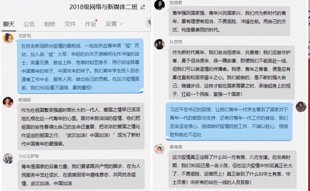 2018级网络与新媒体2班团支部书记孙思雨:“习近平总书记给北京大学援鄂医疗队的重要回信,让我们看到了习近平总书记对青年一代的期盼与希望,尽管在这场疫情中,我们这些非医学院的学生没有办法冲到一线奉献自己的爱心,但我们也通过爱心捐款、志愿服务等体现自己的一份力量。在这场新冠肺炎疫情防控斗争中,广大青年奋战一线,他们不畏艰险、甘于奉献,彰显了青春的蓬勃力量,证明了新时代青年的勇气与担当。”
