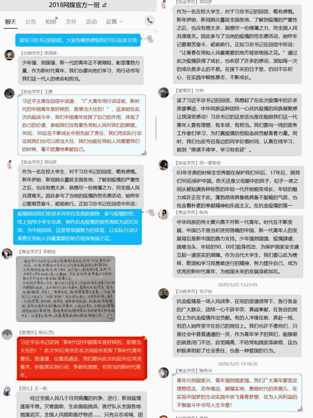 2019级编辑1班团支部通过线上主题班会的形式,团支书以“努力成为有理想有担当的社会主义青年”为主题,通过QQ直播课堂想同学们分享了讲话精神的原文,并组织了班级同学研讨。